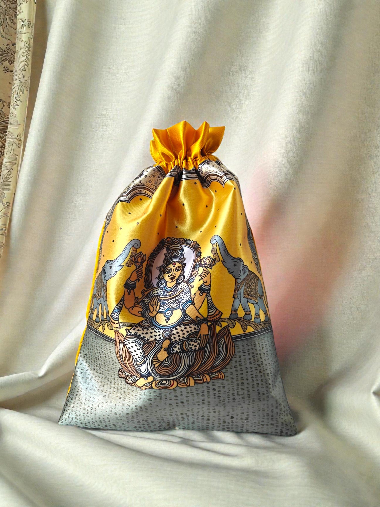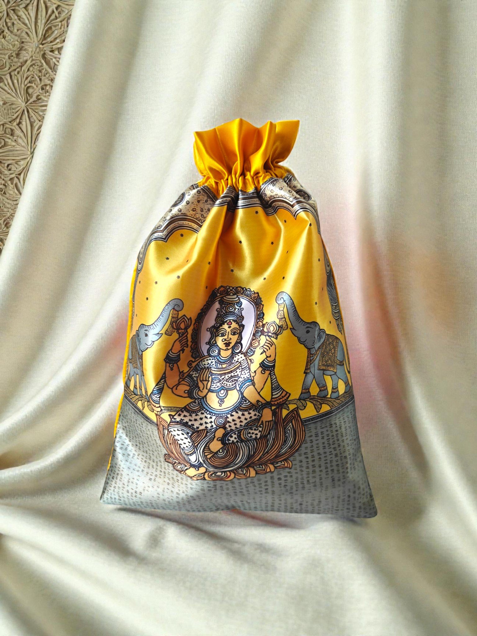 This handcrafted potli is designed using premium raw silk fabric and showcases a beautifully detailed Gaja Lakshmi inspired motif. The traditional artwork enhances the richness of the fabric, creating a graceful blend of cultural design and functional utility.
