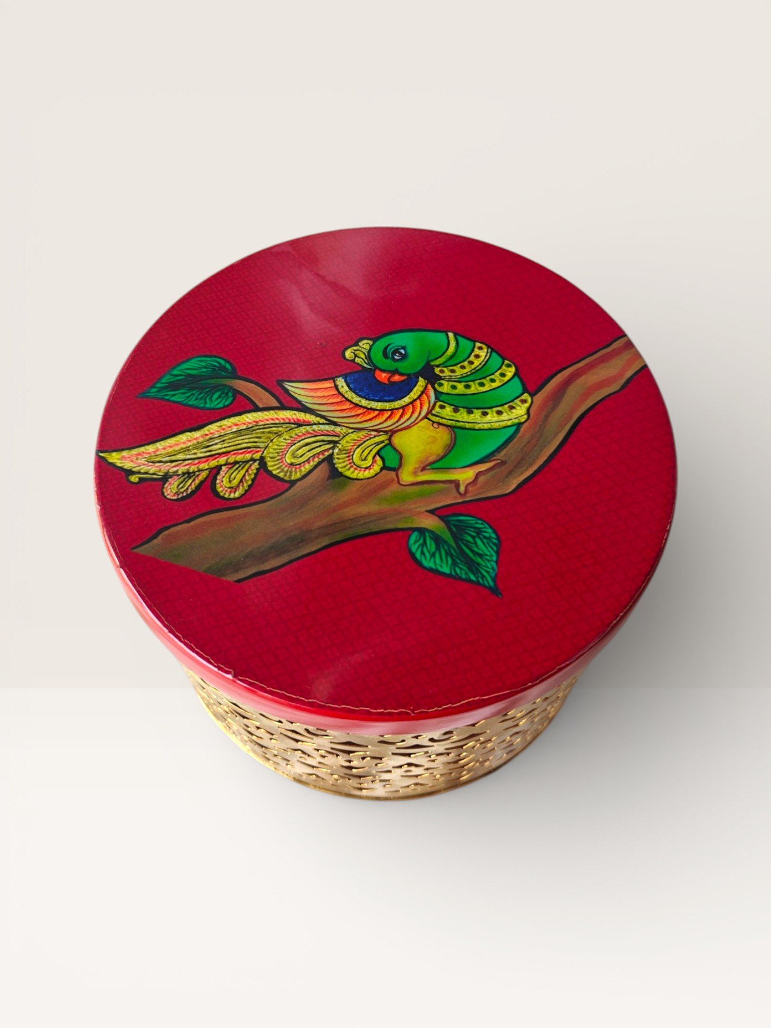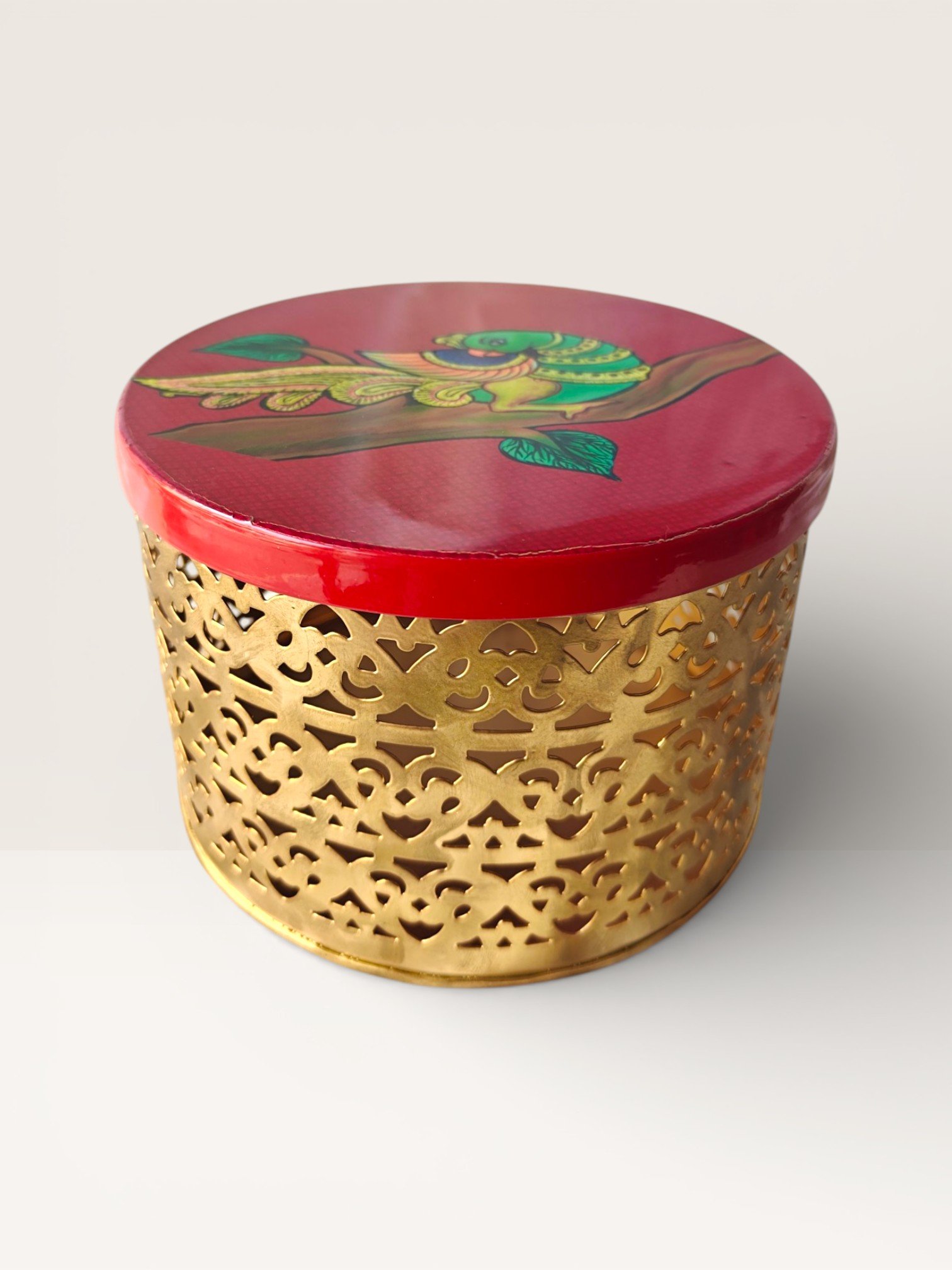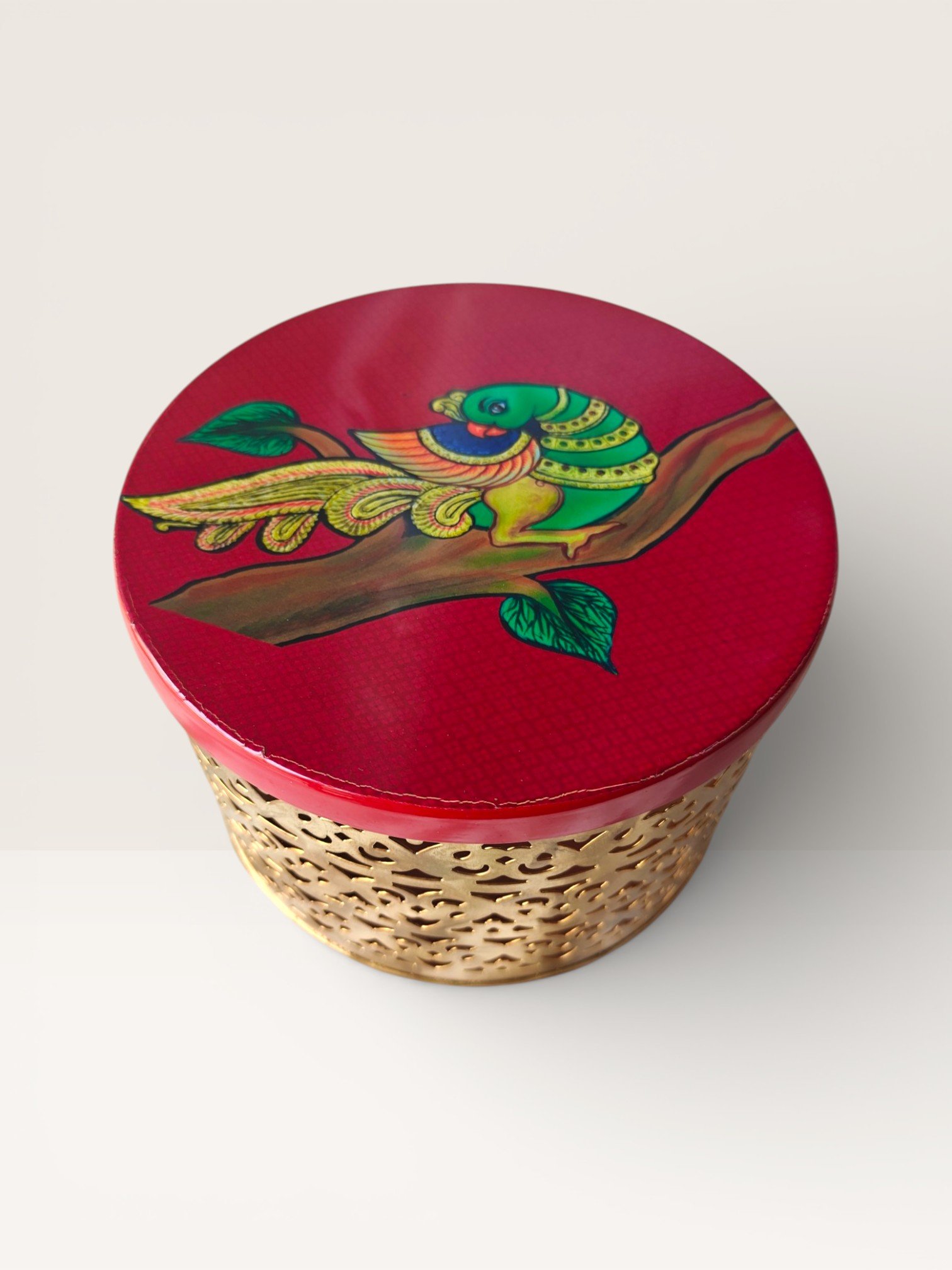 Handcrafted metal round box featuring a traditional parrot motif design on the lid and an elegant decorative metal base. Designed for both storage and gifting, this stylish box adds a cultural touch to celebrations. Ideal for wedding favors, festive gifting, and storing small keepsakes.