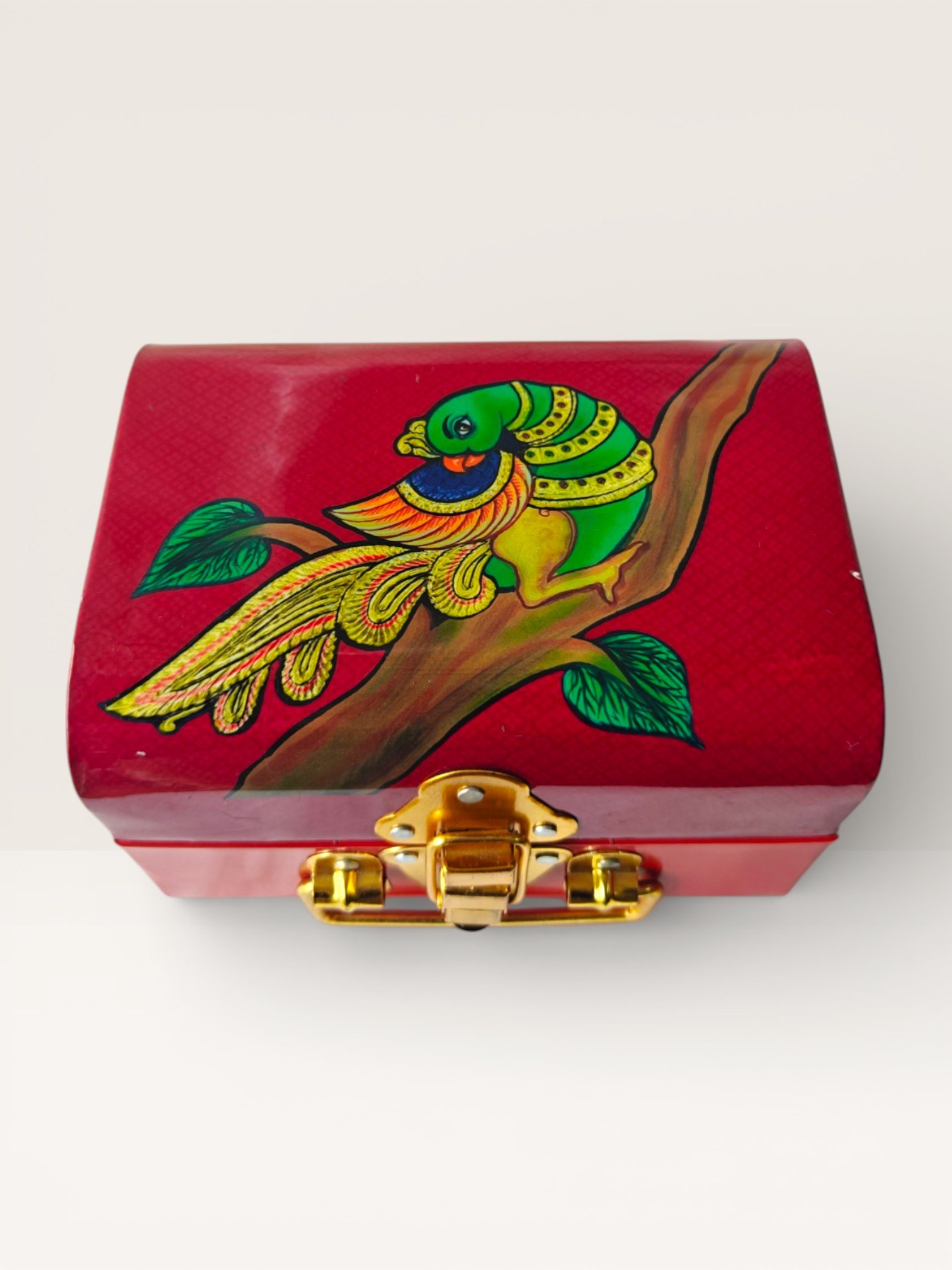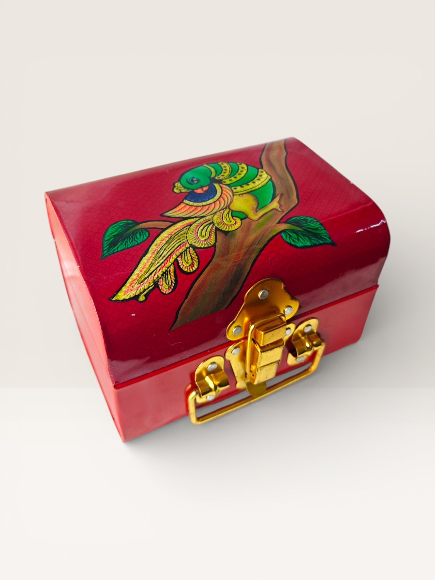 Handcrafted decorative trunk box featuring a traditional parrot motif inspired by classic Indian artwork. Designed with a secure clasp and elegant trunk shape, this box is ideal for storing jewelry, small keepsakes, or gifting essentials. Perfect for festive gifting, wedding favors, and cultural celebrations.