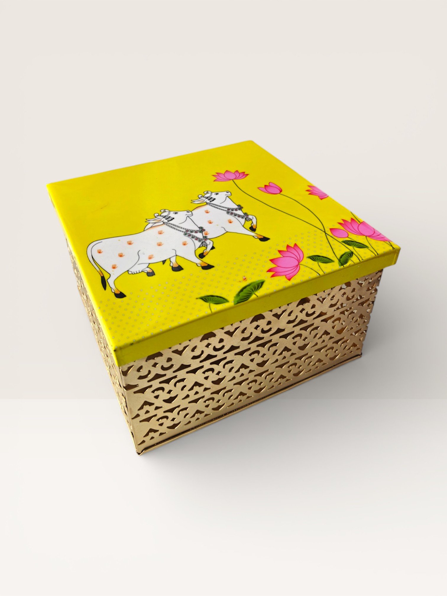 This handcrafted metal box is inspired by the artistic heritage of traditional Pichwai design. The detailed artwork on the lid combined with the decorative metal base creates a sophisticated storage piece that blends cultural elegance with modern functionality.