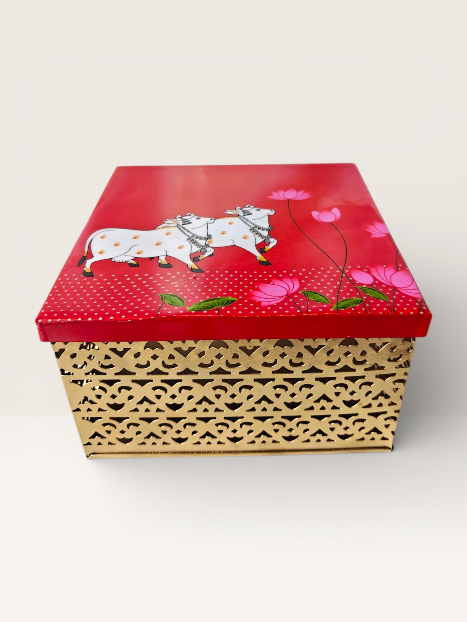Bautifully handcrafted metal gift box inspired by traditional Pichwai art. Designed with intricate detailing and a decorative lid, this elegant box is perfect for storing small essentials or presenting thoughtful gifts. Ideal for weddings, festive celebrations, and return gifts, it adds a refined cultural touch to any occasion.