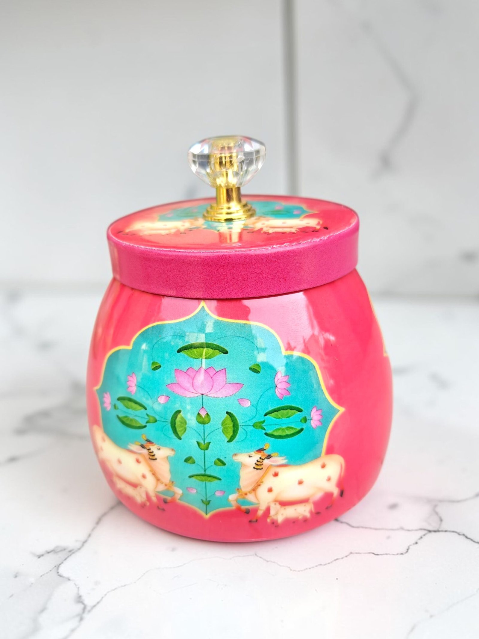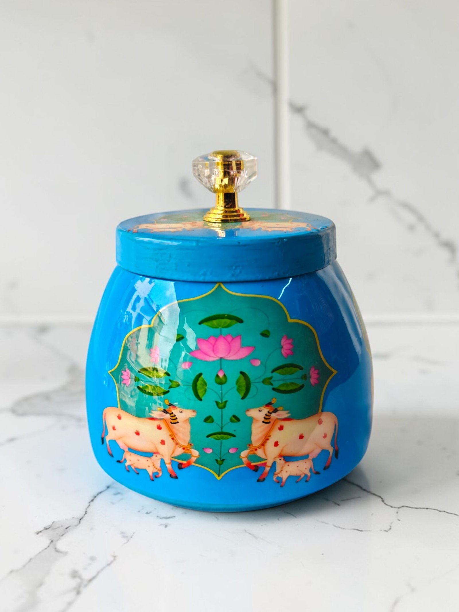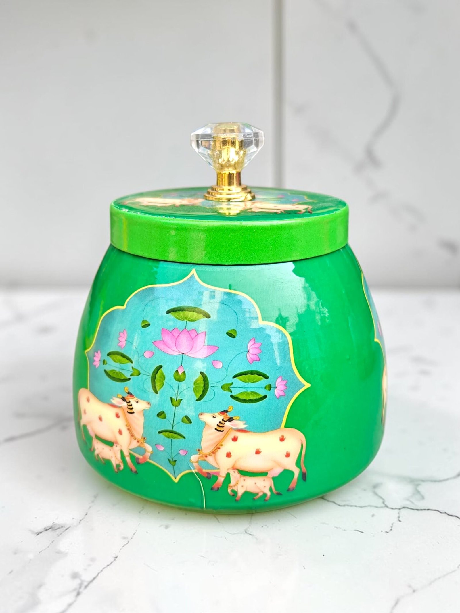 Beautifully handcrafted metal jar inspired by traditional Pichwai art. Designed with elegant detailing and a decorative lid, it serves as a stylish storage solution as well as a unique gift. Ideal for festive gifting, wedding favors, or home décor, this jar blends cultural charm with practical functionality.