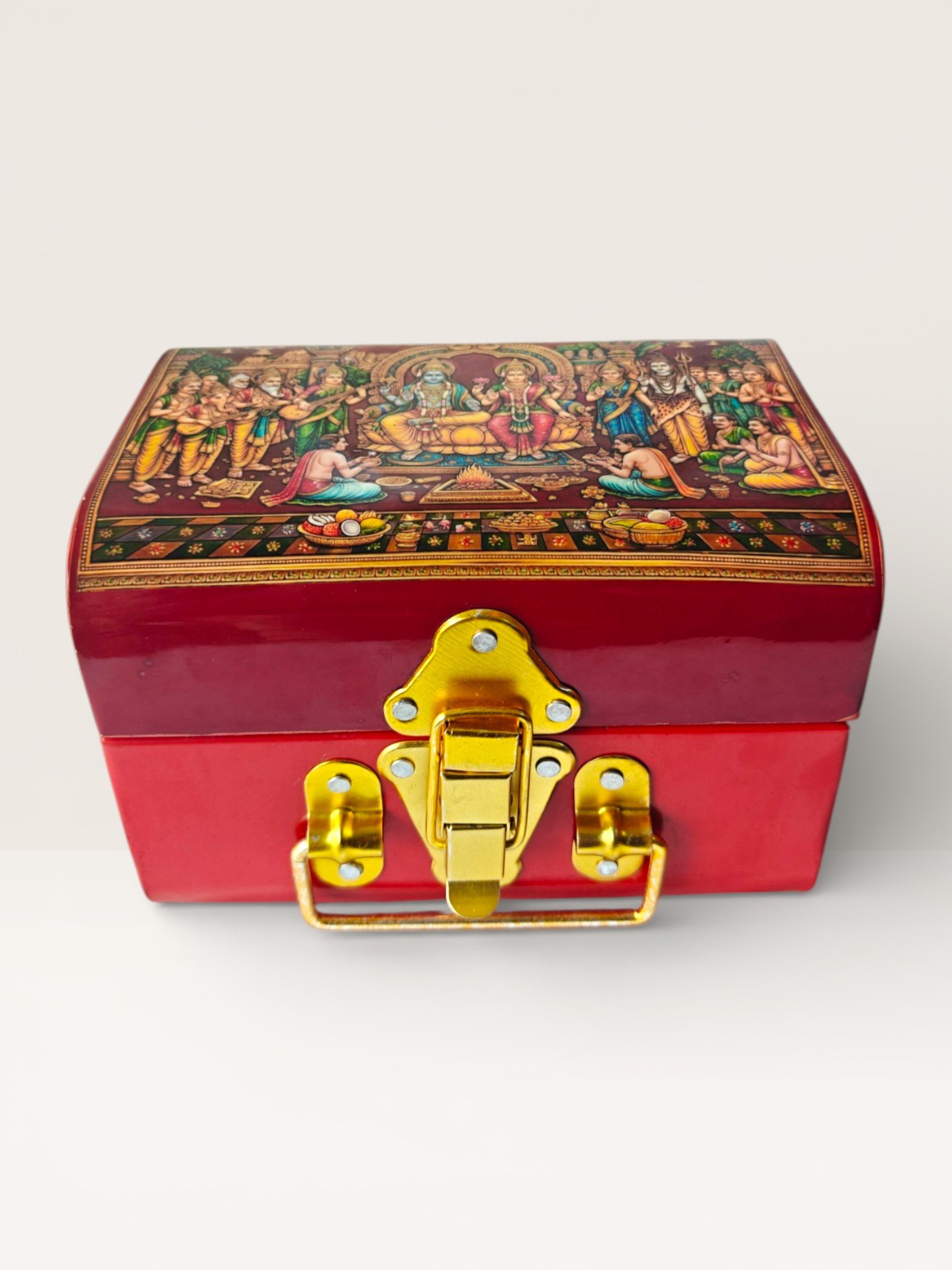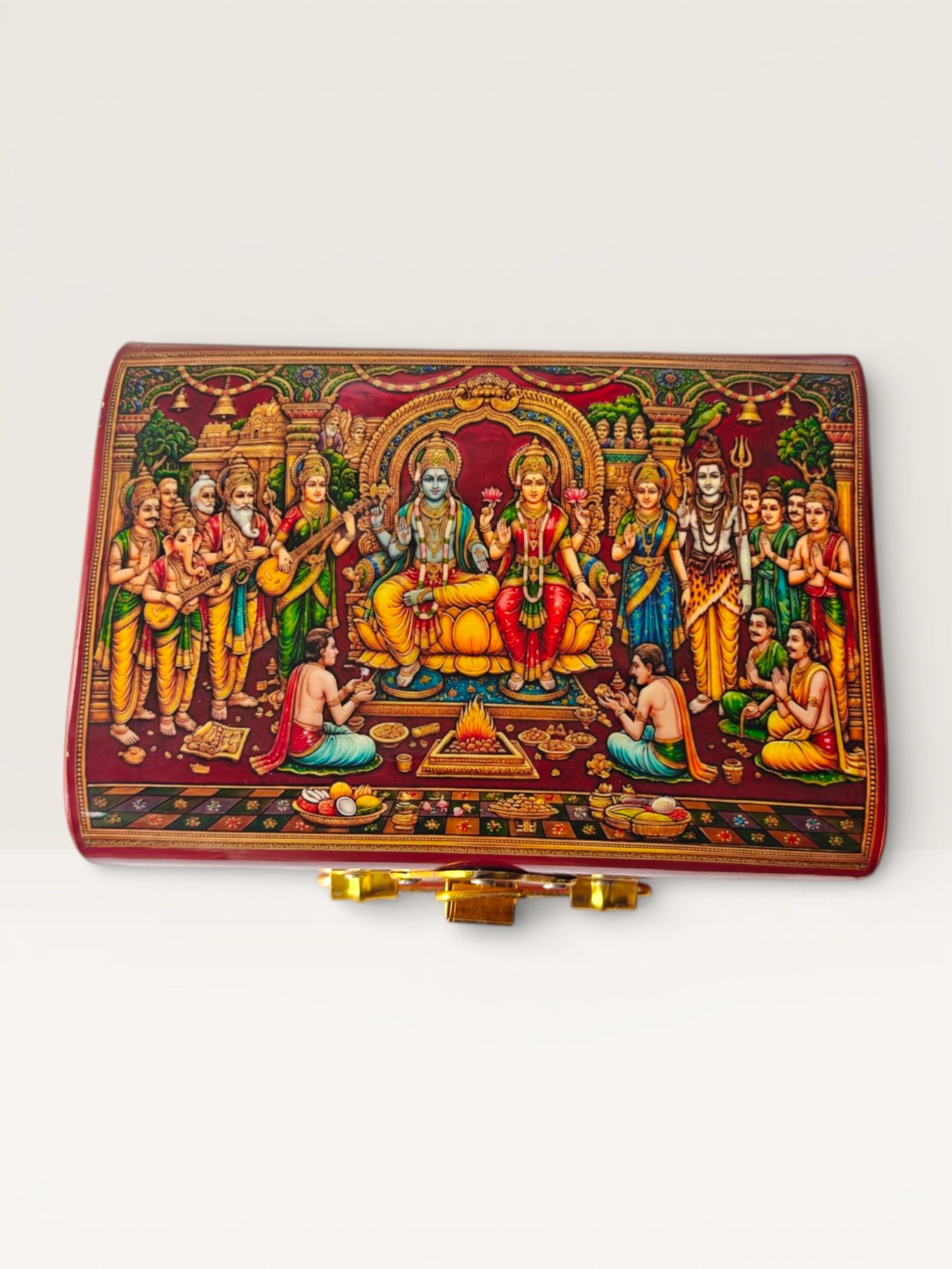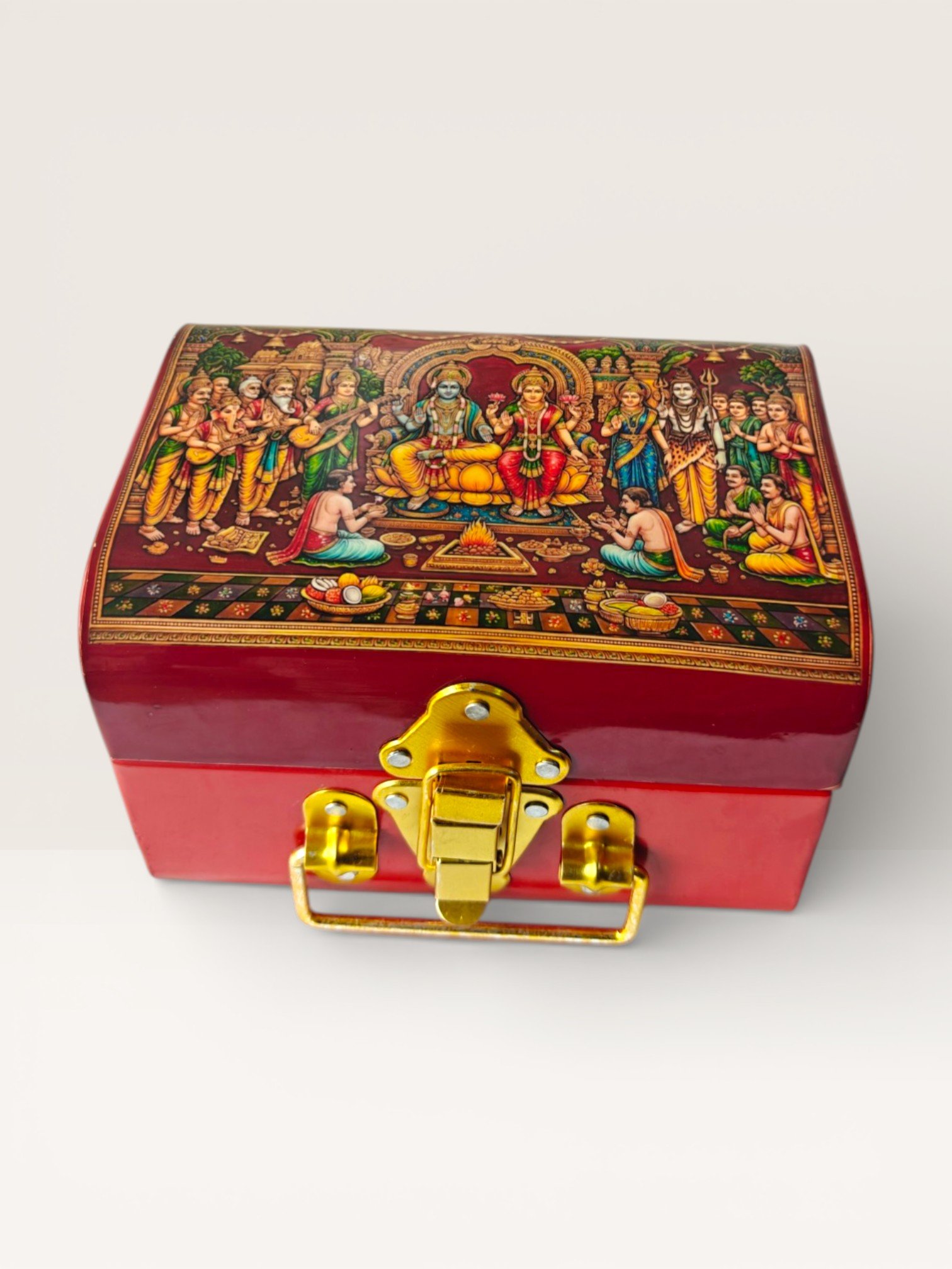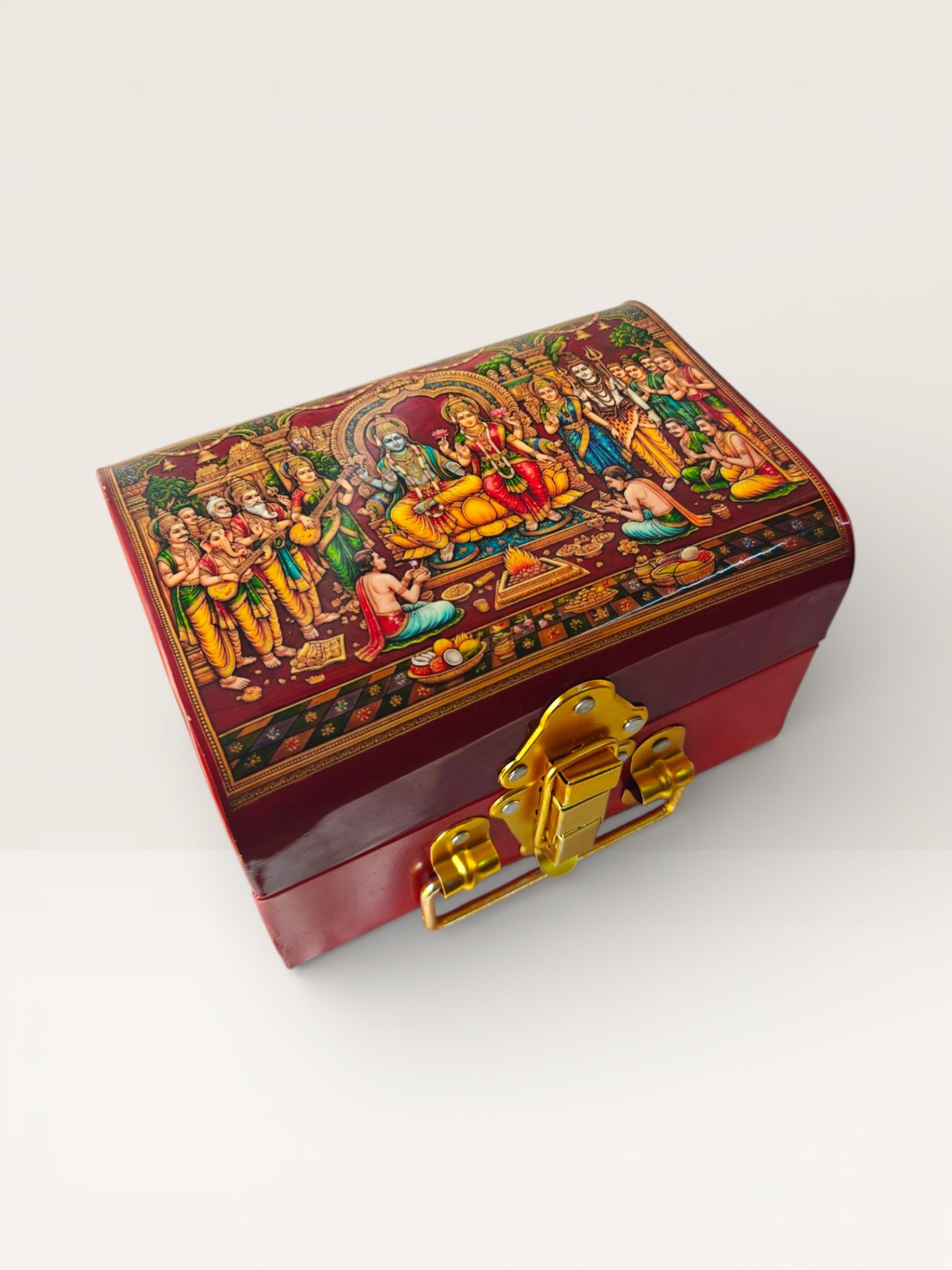 Hndcrafted trunk box featuring traditional Satyanarayan artwork, designed to bring spiritual and cultural elegance to special celebrations. With its decorative metal clasp and classic trunk design, this box is ideal for storing gifts, keepsakes, or ceremonial items, making it a meaningful choice for wedding gifting and festive occasions.